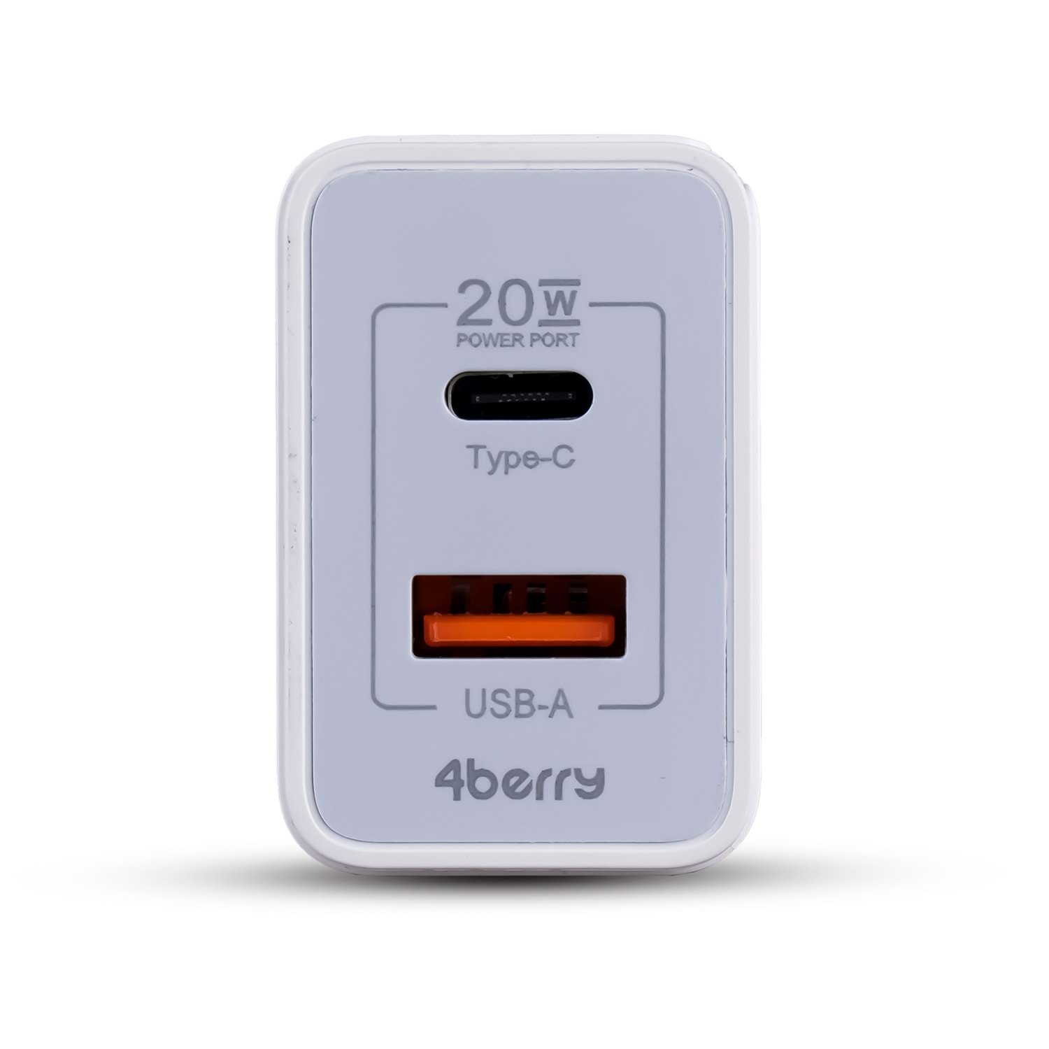 4berry AD88 süper hızlı şarj adaptörü, çift port tasarımı (USB-A & USB-C) sayesinde aynı anda iki cihazınızı güvenle şarj etmenizi sağlar. 20W çıkış gücü ile PD (Power Delivery) ve QC3.0 teknolojilerini destekler, böylece telefon, tablet ve diğer elektronik cihazlarınızı çok daha kısa sürede şarj edebilirsiniz.